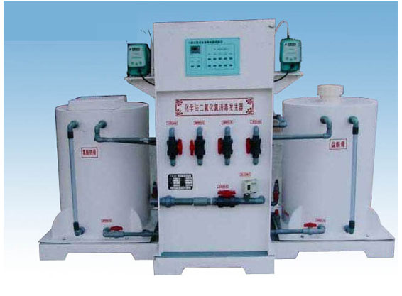 以上反應的原料經各自的計量裝置,準確計量后投加到反應器中,反應生成二氧化氯氣體,經射流器抽吸與水混合制成高效的二氧化氯消毒液。