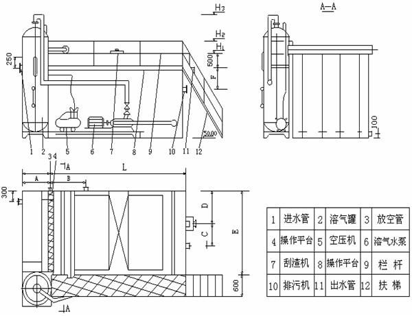 1. 調節池 2. 投凝劑設備 3. 污水泵 4. 折板聚凝池 5. 釋放器 6. 刮渣機 7. 氣浮池 8. 溶氣水存放池 9. 污泥池 10. 溶氣水泵 11. 溶氣罐 12. 空壓機