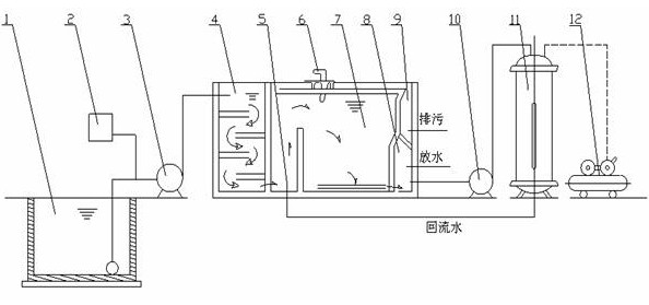 氣浮裝置的工作原理是在一定條件下,將大量空氣溶于水中,形成溶氣水,作為工作介質,通過釋放器驟然減壓,快速釋放,產生大量微細氣泡粘附于經過混凝反應后廢水中的“礬花”上,使絮體上浮,同時用刮渣機刮除,從而迅速地除去水中的污染物質,達到凈水的目的。 產品特點 1、裝置廣泛應用于造紙、印染、制革、電鍍、紡織、石油、化工、食品等相對領域; 2、在給排水處理工藝中對固液、液液和比重近于水的微小懸浮物的進行去除; 3、占地面積小,單位面積產水量高,渣體含水率低; 4、溶入的氣體經驟然減壓釋放,產生的氣泡不僅微細、粒度均勻,密度大,而且上浮穩定,對液體擾動微小,特別適用于對疏松絮凝體、細小顆粒的固液分離; 5、加壓條件下,空氣溶解度大,供氣浮用的氣泡數量多,能夠確保氣浮效果; 6、部分回流式處理效果顯著、穩定、并能較大的節約能耗; 7、工藝過程及設備簡單、造價低、便于管理和維護; 8、設備調試后,正常運行可達到自動化無人管理狀態。 適用范圍 1、電鍍廢水重金屬離子,如鉻、鋅、銅、鎳、鉛等總含量在50ppm以下,去除率均70%以上; 2、印染廢水的色度去除達90%左右,COD去除率達60~70%左右,BOD去除率達50%左右; 3、食品屠宰和制革廢水的COD去除率達70%左右,懸浮固體去除率達90%左右; 4、煉油廢水的油脂,可降到10mg/L以下,廢水能達到澄清程度; 5、對化工廢水和顏料油漆等,COD去除率達74%,色度去除率達93%左右; 6、造紙白水的纖維回收率可達95%左右,COD去除率達86.7%左右,清水完全回用; 7、大池沐浴水濁度可穩定在10℃以下,水中的細菌有較大幅度下降; 8、生活飲用水及工業的濁度可凈化的5℃以下,同時對色度耗氧量降低有良好的效果。 工藝說明 本設備的工作方法屬于加壓溶氣氣浮法,其工作原理:在一定條件下,將大量的空氣溶于水,形成溶氣水,作為工作介質,通過釋放驟然減壓,快速釋放,產生大量的微細氣泡,粘附于經過混凝反應后的廢水中的"礬花"上,使絮體上浮進行清除。 1. 調節池 2. 投凝劑設備 3. 污水泵 4. 折板聚凝池 5. 釋放器 6. 刮渣機 7. 氣浮池 8. 溶氣水存放池 9. 污泥池 10. 溶氣水泵 11. 溶氣罐 12. 空壓機