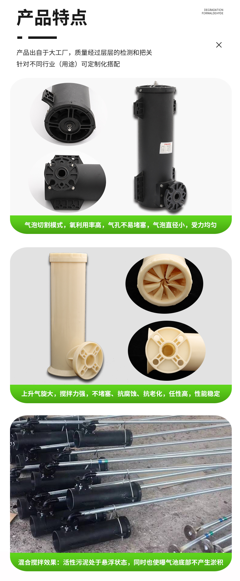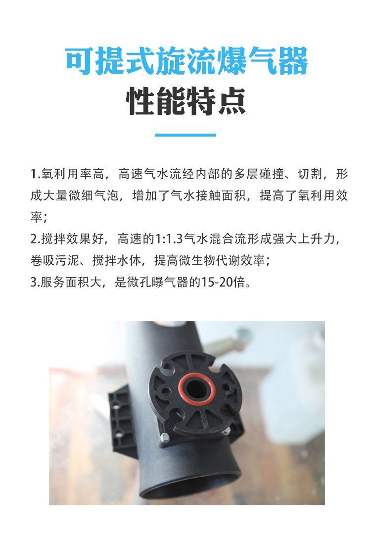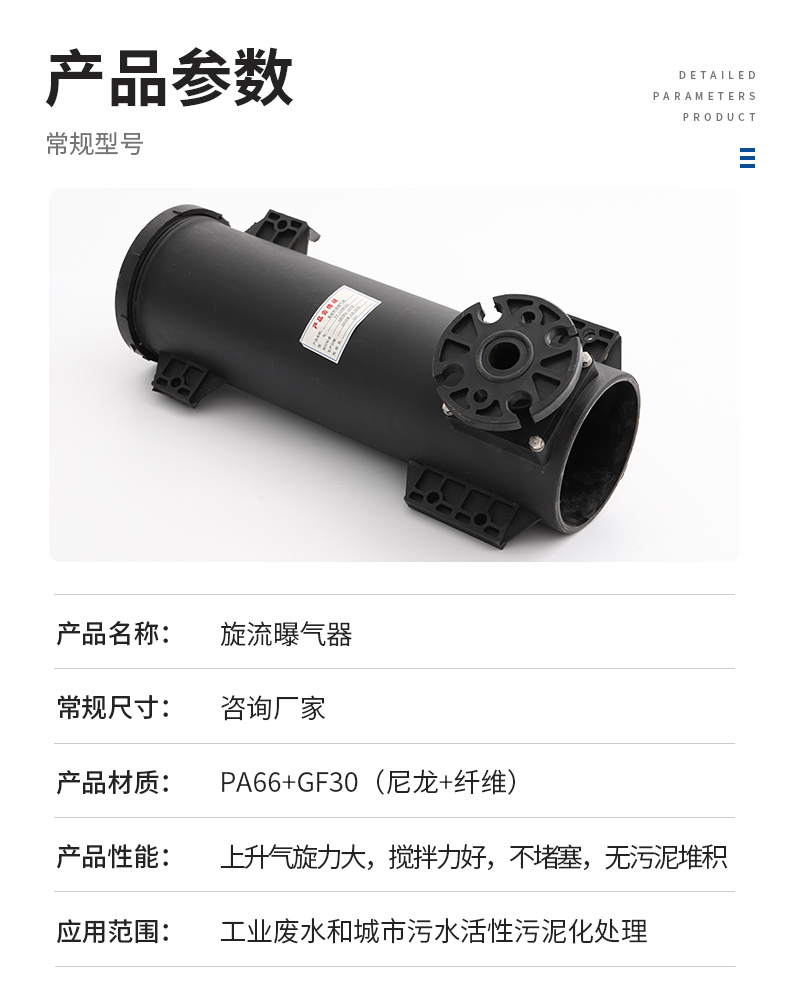 旋流曝氣器主要由外筒、進(jìn)氣管、回流板、楔形結(jié)構(gòu)四部分組成,可提升旋流曝氣器溶氧效率高,壓力損失小,攪拌能力強(qiáng),不堵塞,池底不積泥,,免維護(hù),間歇運(yùn)行,使用壽命長(zhǎng);與傳統(tǒng)的螺旋曝氣器、發(fā)散式曝氣器、穿孔管曝氣器相比,可升降旋流曝氣器的能耗可降低25%以上。 可升降旋流曝氣器整體由尼龍66+30%玻璃纖維制成,,具有較高的耐腐蝕性。其高度為42厘米,內(nèi)徑為12厘米,進(jìn)氣口中心距曝氣頭底部5厘米。