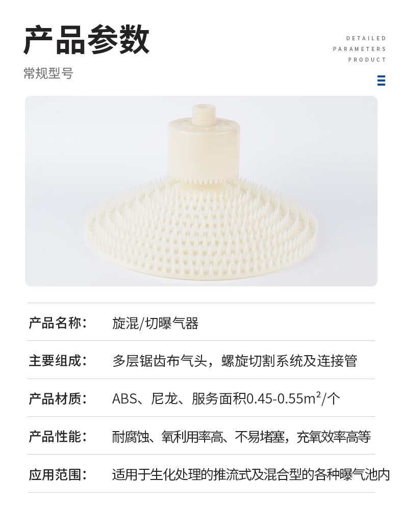 旋混式曝氣器采用多層螺旋切割的型式進行充氧曝氣,旋混式曝氣器當氣流進入260型混流型曝氣器時,氣流首先通過二道螺旋切割系統,切割后進入下層的的多層鋸齒型布氣頭,進行多層切割,使氣泡切割成微氣泡,這樣大大提高了氧的利用率,具有布氣均勻,充氧效率高的特點。