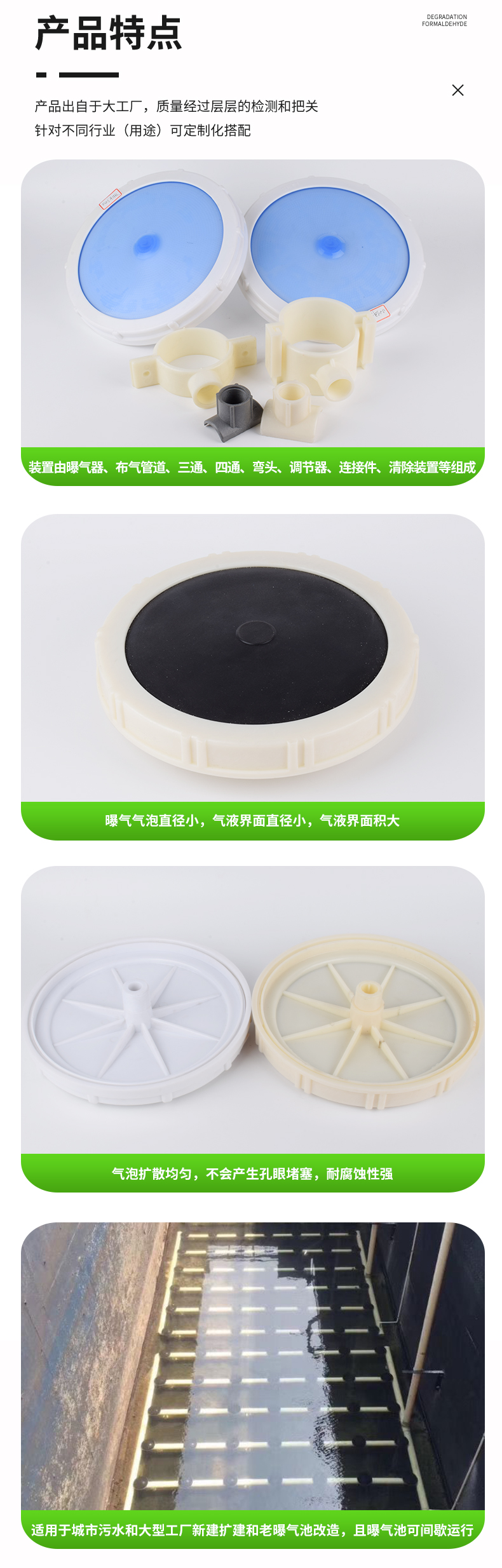 平板膜片曝氣器,該裝置曝氣氣泡直徑小,氣液界面直徑小,氣液界面積大,氣泡擴散均勻,不會產生孔眼堵塞,耐腐蝕性強,經上海同濟大學環境工程學院和中國市政工程華北設計院進行清水和污水充氧測試,并經50多家用戶多年使用效果良好(比常規產品固定螺旋曝氣器,散流曝氣器和穿孔管曝氣器能耗降低40%,或增加污水處理量40%)。特別適用于城市污水和大型工廠新建擴建和老曝氣池改造,且曝氣池可間歇運行。