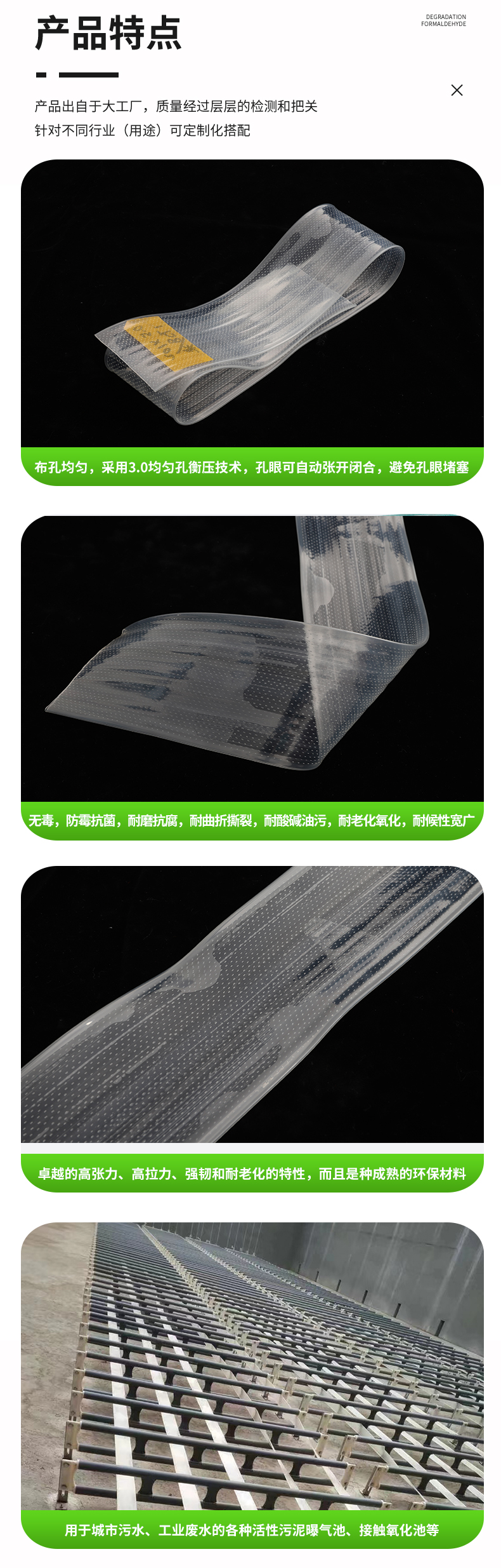 曝氣軟管是引進(jìn)西德技術(shù)開(kāi)發(fā)成功的新型增氧曝氣器。薄壁、直通道極大降低了曝氣阻力損失;可變孔及狹縫自動(dòng)開(kāi)閉,徹底解決了曝氣器的堵塞問(wèn)題;軟管為線狀曝氣,使布?xì)饩鶆,并形成豎向環(huán)流,攪拌混合更均勻;氣泡小,氧利用率和動(dòng)力效率高。