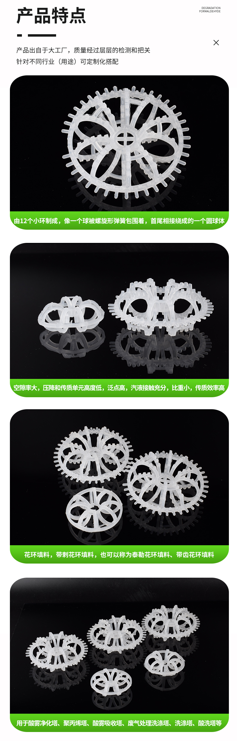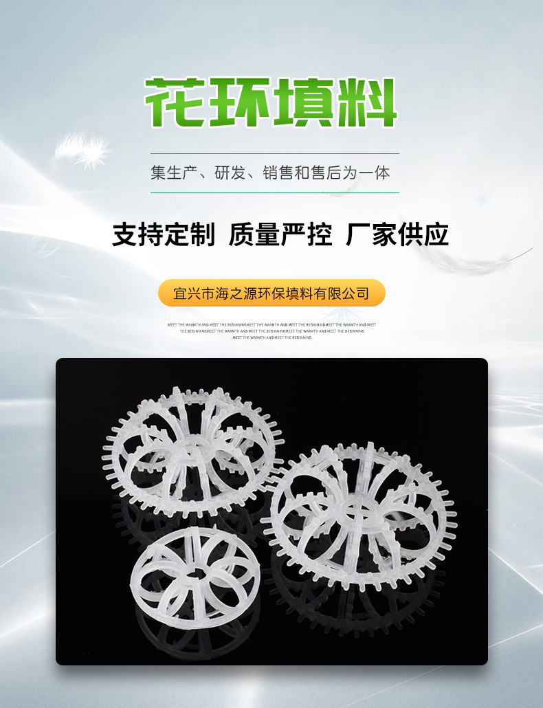 花環填料也稱梅花環填料是由許多圓環結繞而成,由于這種填料的間隙處能有較高的滯液量,可使塔內液體停留時間較長,從而增加了氣液的接觸時間,提高了填料的傳質效率。具有空隙率大,壓降和傳質單元高度低,泛點高,汽液接觸充分,比重小,傳質效率高等特點,多用于氣體洗滌、凈化塔中。