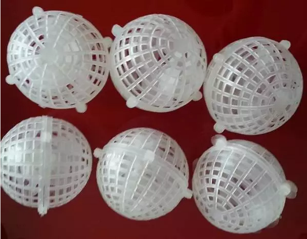 球形填料一般采用塑料注塑而成,其結構有多種。球形填料的特點是球體為空心,可以允許氣體、液體從其內部通過。由于球體結構的對稱性,填料裝填密度均勻,不易產生空穴和架橋,所以氣液分散性能好。球形填料一般只適用于某些特定的場合,工程上應用較少。